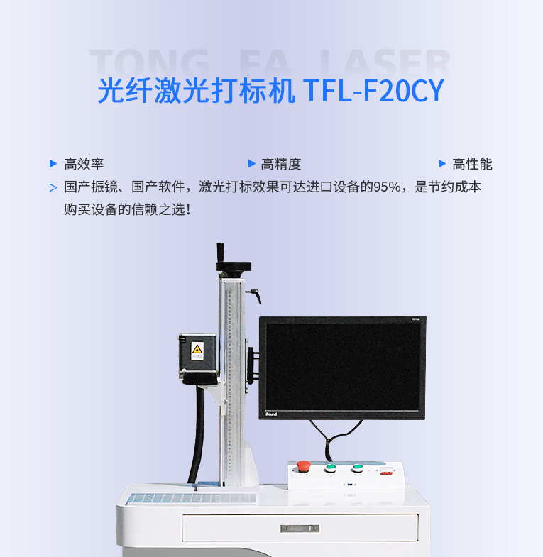 球盟会(中国)激光研发TFL-F20CY激光打标机,金属材料和塑胶材料都进行打标加工,本激光镭雕机配置成熟的20W和30W国产光纤激光器,国产振镜、国产软件,性价比高,激光打标效果可达进口设备的95%,是节约成本购买设备的信赖之选!