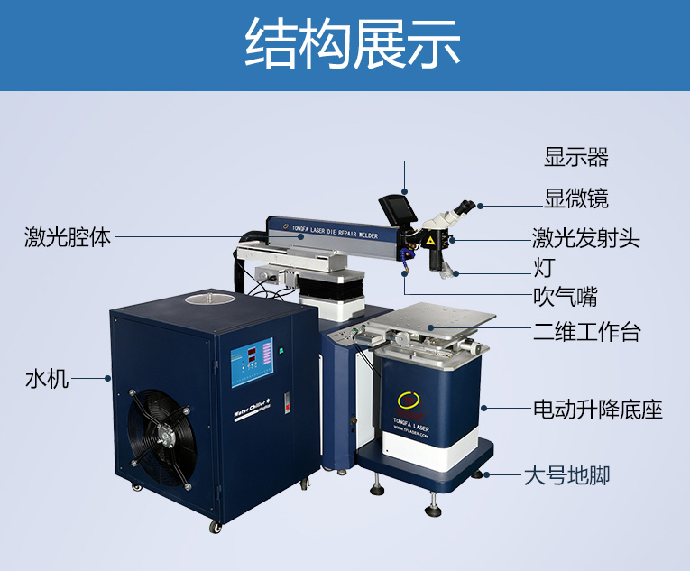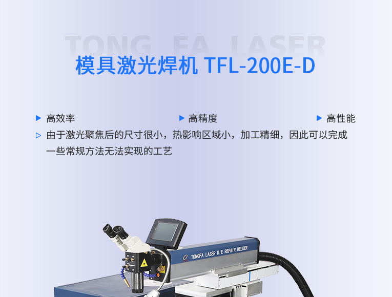 出口型模具激光焊机是球盟会(中国)激光公司专门为出口国外客户使用而设计的系列机型TFL-200E-D,配置激光头电动升降,同时配置操纵杆无极调速控制XY横向和纵向电动移动。适用于各类精密注塑模具、压铸模具等模具激光修补焊接;同时也适合铸件沙孔激光修补、模具崩缺激光修复、过切加工等的激光修补;各类金属结构件、金银首饰的激光焊接加工。