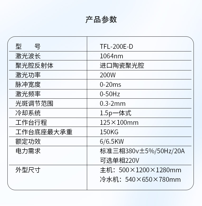 环境湿度:不高于80% 。因为焊机电源打开后,激光晶体就会持续的被冷却系统冷却,因为冷却水一般会低于室温,当环境湿度过大的时候,而激光晶体的温度又低于室温,这时激光晶体的两个端面上会凝结水雾,当激光输出的时候,这些水雾会大大降低激光输出能量,而且这些附着在激光晶体端面上的水,干了以后,会在激光晶体的膜面上留下痕迹,这将会大大加快激光晶体膜面的老化。所以,为了防止这种情况的发生,冷水机的水温设定,夏天不可以低于室温3度,冬天不可以低于5度。