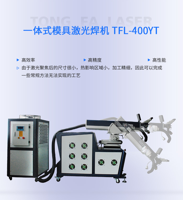 球盟会(中国)激光一体式模具激光焊机TFL-400YT是一款多种功能融合一体的新型模具激光焊接机,针对特大型塑料模具激光焊、中型注塑模具激光烧焊、小型塑胶模具激光补焊、压铸模激光补焊具等各类模具可实现超精密修复,帮您解决大型汽车模具修复难题,不需要模具移动,电动工作台与立体旋转激光头完美结合,操作杆控制运动移动实现轻松激光修复大型模具,同时也保留了传统手动工作台超精密修复模具功能。
