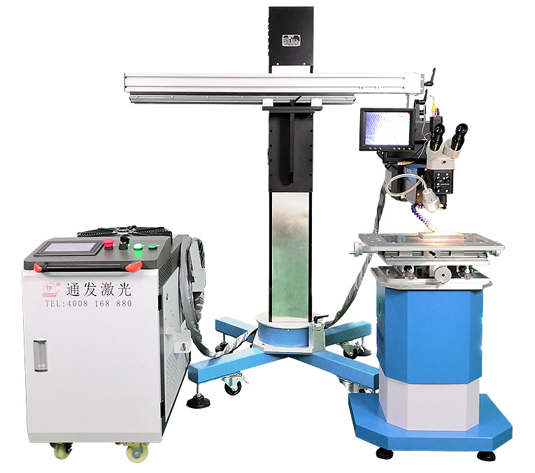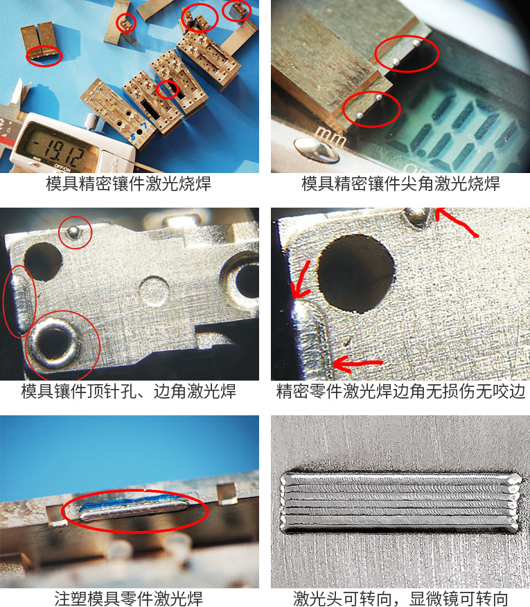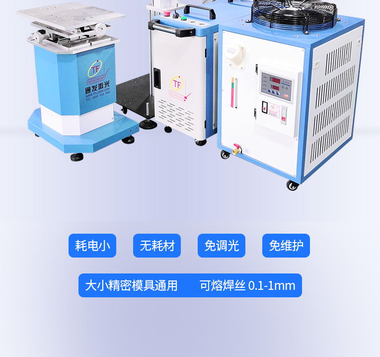 1、采用光纤激光器,反射率高,能量强,免维护,免调光,功耗少,相比传统 模具焊来说,体积小,安全,稳定性好超长使用寿命。