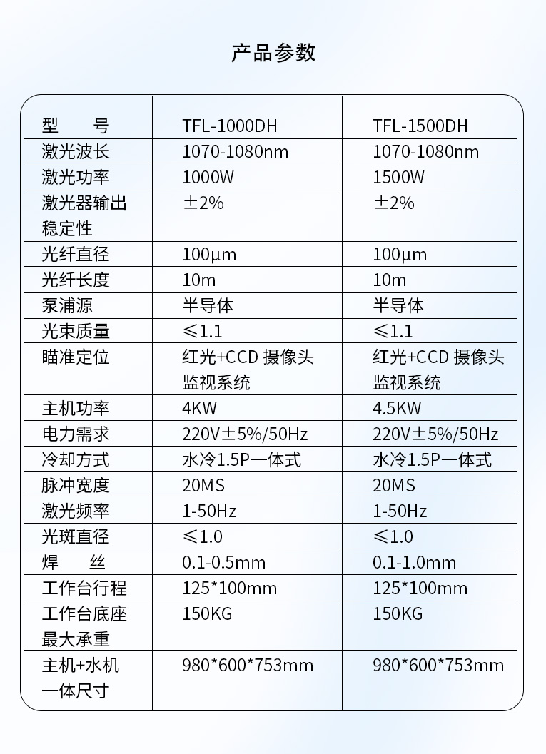 采用光纤激光器,反射率高,能量强,免维护,免调光,功耗少,相比传统 模具焊来说,体积小,安全,稳定性好超长使用寿命。 1000W光纤激光器,满足铜、铝焊接量大的模具及球盟会在线登录官网焊接加工需要。 高承重底座及工作台,保持轻便灵活的优点,同时提供更高承载能力。 配备.1.5P大功率一体式水冷水机,保证了大功率焊接的稳定性。