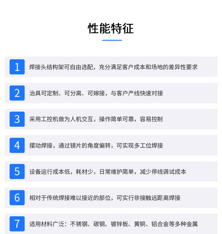 2、强大的PC控制,易于编程、调试和维护。可完成自动或半自动的点焊、对接焊、叠焊、密封焊,针对复杂的平面直线、圆弧及任意轨迹的焊接。